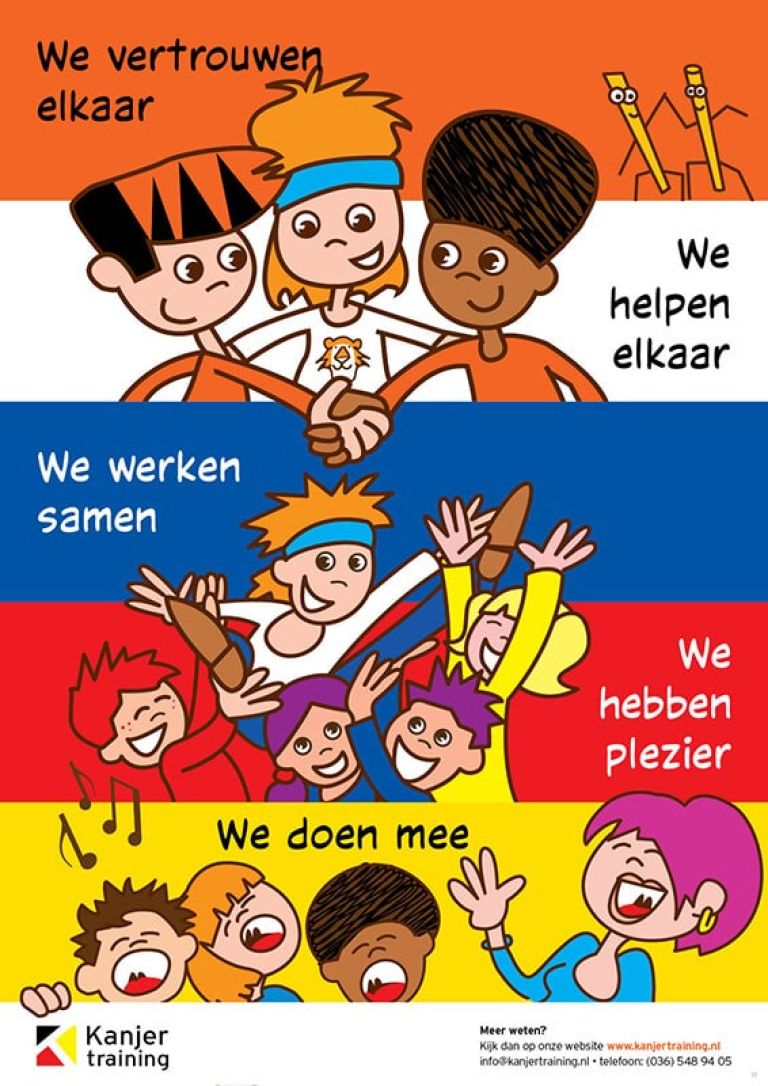 Onze school is een Kanjerschool. Door middel van de Kanjermethode leren we kinderen respectvol omgaan in sociale situaties. Je kunt hierbij denken aan een compliment geven en ontvangen, omgaan met de gevoelens van een ander, je grenzen aangeven, je mening geven zonder een ander te kwetsen, samenwerken, vriendschappen aangaan en onderhouden. In de Kanjermethode is er ook aandacht voor het tegengaan van pestgedrag.